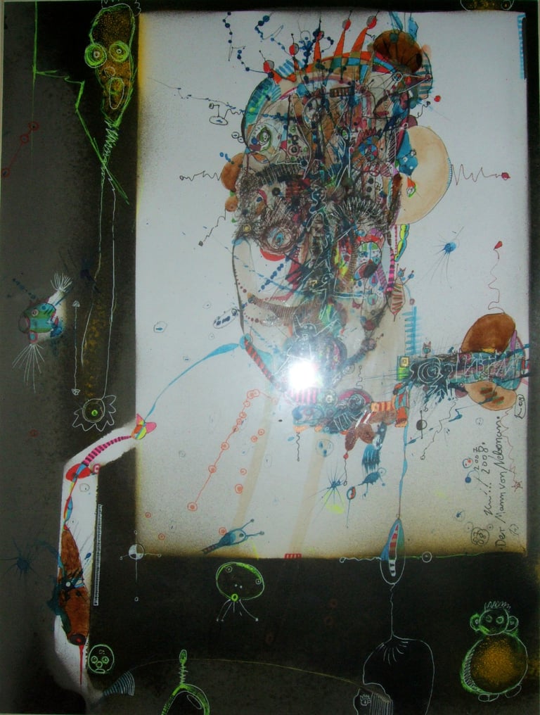 On one occasion my friends trashed this teddy bear, pulling one of the eyes off it and busting it's head open a little so the white foam inside spilled out. I remember being unusually upset about this. I had completely forgotten this event until it came back to me after Kate's death. The first apartment I stayed in, after I moved on from Budapest to Berlin, a month after she had died in hospital in Budapest, had some disturbing paintings on the wall. This was one of them: